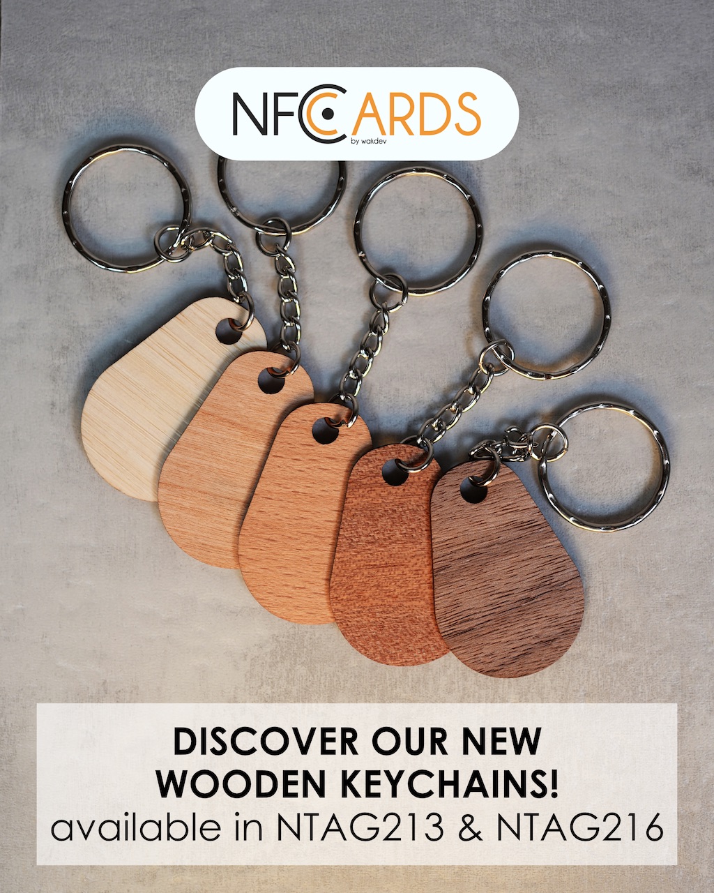 Get your wooden keychains on NFC.CARDS: Available in bamboo, beech, cherry tree, sapele & walnut, and can be used plain or engraved.